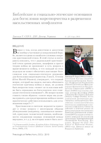 Searle, Joshua T. (2013) Библейские и социально-этические основания для богословия миротворчества в разрешении насильственных конфликтов [The Biblical and Social-Ethical Grounds for a Theology of Peacemaking in Resolving Violent Conflicts]. Theological Reflections: Eastern European Journal of Theology (2013/S). pp. 215-226. ISSN 2789-1577