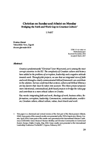Glavaš, Dražen (2011) Christian on Sunday and Atheist on Monday Bridging the Faith and Work Gap in Croatian Culture. Part I. Kairos: Evangelical Journal of Theology, 11 (1). pp. 29-66. ISSN 1846-4599