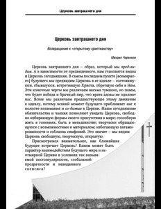 Cherenkov, Mykhailo N. (2016) Церковь завтрашнего дня: возвращение к «открытому христианству» [The church of tomorrow: returning to "Open Christianity]. In: Тело Христово: константы и метаморфозы священного. Философско-религиозные тетради [Philosophical and religious notes] (8). Evangelical Christians-Baptists in Russia, Moscow, pp. 61-74. ISBN 978-5-905150-08