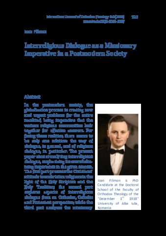 Filimon, Ioan (2015) Interreligious Dialogue as a Missionary Imperative in a Postmodern Society. International Journal of Orthodox Theology, 6 (2). pp. 125-153. ISSN 2190-0582