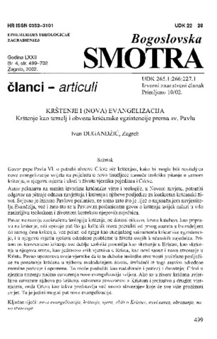 Dugandžić, Ivan (2002) Krštenje i (nova)evangelizacija. Krštenje kao temelj i obveza egzistencije prema sv. Pavlu [Baptism and (New) Evangelization. Baptism - the Foundation and Obligation of Christian Existence According to St. Paul]. Bogoslovska smotra, 72 (4). pp. 499-520. ISSN 1848-9648