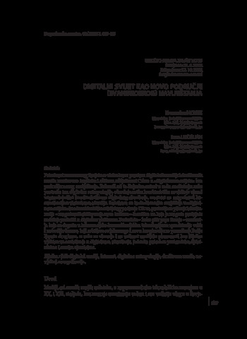 The presence of the contemporary human being in virtual space of digital media and social networks necessarily also implies active inclusion of the Church in the »digital world« as an area of new proclamation. Starting from that fact, in this article the authors analyse some postulates of so‑called digital anthropology, discuss characteristics of the proclamation of faith, and compare them with characteristics of the digital environment, while reflecting on possibilities of communication in the virtual environment. Given the fact that dynamics of proclamation in the »digital world« has characteristics of missionary activity of the Church, the question of inculturation is raised – possibility of forming a new culture – as well as ways in which it might be possible to transmit existing contents on the digital platform. Since – as Pope Francis writes – the revolution that is taking place in information‑communication technologies »represents a great and exciting challenge that demands fresh energies and new imagination in transmitting the beauty of God to others«, the article also points out the importance of media literacy as a key skill for finding one’s way in the digital environment. This skill is equally necessary for pastoral workers and the faithful.