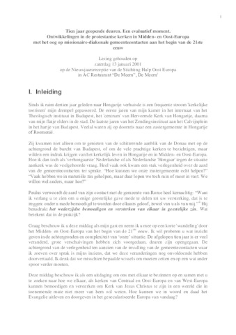 Tien jaar geopende deuren. Een evaluatief moment. Ontwikkelingen in de protestantse kerken in Midden- en Oost-Europa met het oog op missionaire-diaconale gemeentecontacten aan het begin van de 21ste eeuw. Nieuwjaarsreceptie van de Stichting Hulp Oost-Europa [Ten years open doors. An evaluation moment. Developments in the Protestant churches in Central and Eastern Europe with a view to missionary-diaconal twinning links congregational contacts at the beginning of the 21st century].